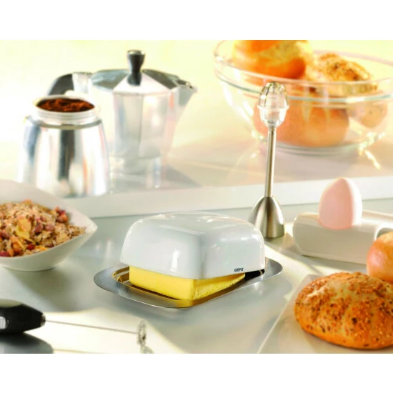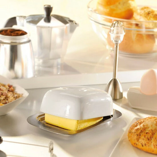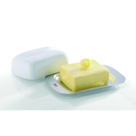 Diese edle Butterdose eignet sich ideal für 250 g Butter. Der flache Boden besteht aus Edelstahl und der Deckel aus Porzellan. Die Dose ist spülmaschinenfest.