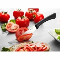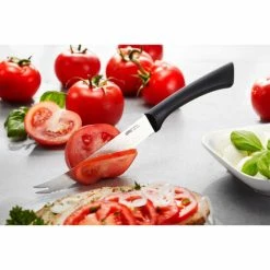 Das Tomatenmesser mit Wellenschliff eignet sich besonders zum Schneiden von Tomaten, kann aber auch für anderes Obst und Gemüse verwendet werden. Die Unterseite des Messers besteht aus einem grob gezackten Teil mit einem scharfen Spalt am Ende zu Aufnahme des Geschnittenen. Der Griff ist sehr benutzerfreundlich und liegt gut in der Hand. Maße: L/B/H 24,5 x 2,3 x 1,7 cm Klingenlänge 13 cm. Spülmaschinenfest