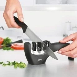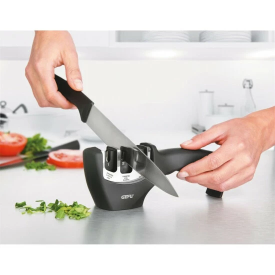 Sind Ihre Messer stumpf? Mit dem GeFu-Messerschärfer haben Sie in drei Schritten schärfere Messer, mit sicherem Halt durch den rutschfesten Gummigriff