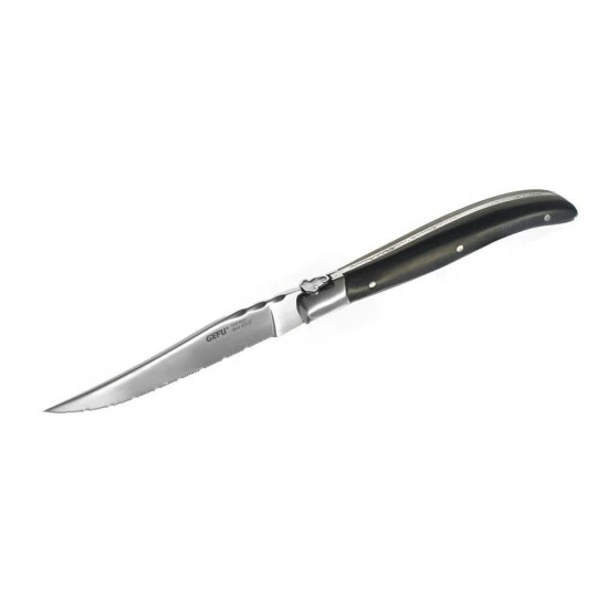 Spezialisierte Steakmesser und Gabeln, professionelle Küchenmesser von Gefu sind eine Reihe von Messern mit außergewöhnlich scharfen und langlebigen Schneidkanten und einer spezifischen Form der Klingen, die am besten zum Schneiden von beliebten amerikanischen Schnitzeln oder traditionellen Schweinekoteletts dienen. Japanische Küchenmesser dieses Herstellers zeichnen sich durch höchste Qualität der Verarbeitung, die Auswahl der besten Rohstoffe und die einzigartige Technologie der Schneidklingen aus. Das Steakmesser „Basco“ ist das perfekte, stilvolle und leichte Küchenmesser mit gezackter Klinge, das perfekt zum Schneiden jeder Art von Fleisch ist. Die lange, flexible und harte Klinge erleichtert die Handhabung des Messers, während der perfekt geformte Griff perfekt in der Hand liegt und das Messer nicht herausrutschen lässt. Das Set von Küchenmessern befindet sich in einer dekorativen, sehr eleganten Box, in der es einfacher ist, sie zu lagern. Die Schere ist sehr solide, langlebig und sieht gut aus. Sie sind aus widerstandsfähigem Kunststoff und sehr strapazierfähigem und hygienischem Edelstahl, und eine Box aus natürlichem Kiefernholz. Die Messer können in der Spülmaschine gewaschen werden.
