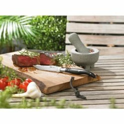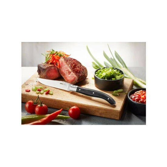 Durch die fein gezahnten Klingen aus japanischem Stahl zerteilen die Messer mühelos Kotelett, Ribeye, T-Bone-Steak & Co. Der Fleischsaft bleibt so im Steak erhalten. Der elegante Griff aus schwarzem Pakkaholz mit Edelstahl-Nieten liegt angenehm in der Hand. Dieses Set ist das ideale Geschenk für jeden Fleischliebhaber! Maße Messer: L 22,5 cm.