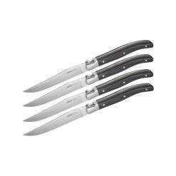 In einer edlen Kiefernholz-Box präsentieren sich die 4 Steakmesser. Durch die ultrascharfen Klingen zerteilen die Messer mühelos T-Bone-Steak & Co. Der elegante Griff aus schwarzem Pakkaholz mit Edelstahl-Nieten liegt angenehm in der Hand. Optisch abgerundet werden die Messer durch ein dekoratives Stierkopfemblem.