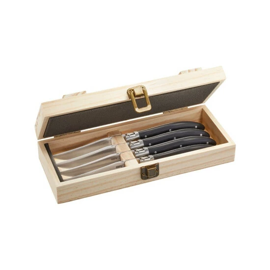 Für den perfekten Schnitt sorgt die fein gezahnte, edel gestaltete Klinge der Steakmesser. In einer edlen Kiefernholz-Box untergebracht sind sie das ideale Geschenk für jeden Fleischliebhaber.