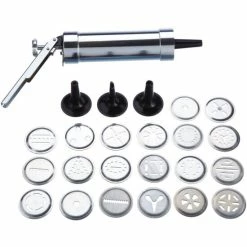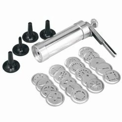Durch die einfache Handhabung sowie die einstellbare Teigmenge, wird das Dosieren und Portionieren zum Kinderspiel. Dadurch wird auch ein direktes Arbeiten auf dem Backblech möglich. Abmessungen: 21,5 x 16,5 x 6,0 cm Material: Aluminium Zubehör: 20 Motiv-Lochscheiben aus Aluminium 4 SpritztÃŒllen mit verschiedenen Motiven aus ABS-Kunststoff Â