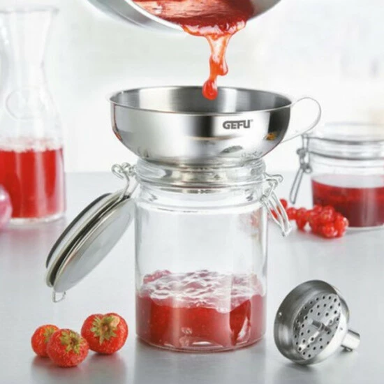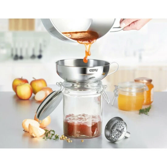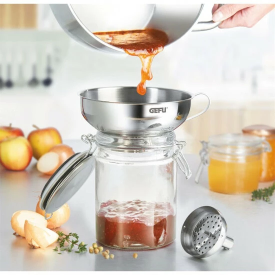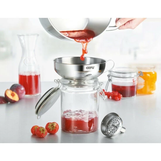 Selbst gekochte Marmelade wird mit dem praktischen VERSARE Einmachtrichter von GEFU mühelos und sauber in Gläser gefüllt. Durch den herausnehmbaren Siebeinsatz gelangt der fruchtige Aufstrich kernfrei ins Glas. Der Edelstahl-Trichter VERSARE ist spülmaschinengeeignet. GEFU Küchenwerkzeuge überzeugen durch ihre Funktionalität und ihre einfache Handhabung sowie ihr zeitloses, stilvolles Design. Die intelligenten Küchenartikel werden aus hochwertigen Materialien hergestellt und begeistern mit gleichbleibend hohen Qualitätsstandards. Mit den gut durchdachten und funktionalen Küchenwerkzeugen von GEFU verkürzen Sie oftmals zeitraubende Herstellungsphasen und lassen damit Raum für das Wesentliche: Die genussvolle Entdeckung der Kochkunst! Wir wünschen Ihnen viel Freude und ein kleckerfreies Abfüllen von Konfitüre, Gelee und Gewürzen, mit dem GEFU Einmachtrichter VERSARE.