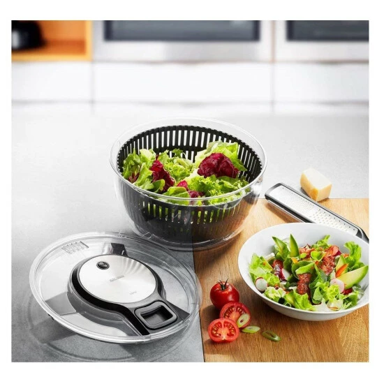 ENORMES FASSUNGSVERMÖGEN – Die Salatschleuder besteht aus einem Behälter mit einer Kapazität von bis zu 5 Litern. Somit kann eine große Menge an Salat und Gemüse trockengeschleudert werden.