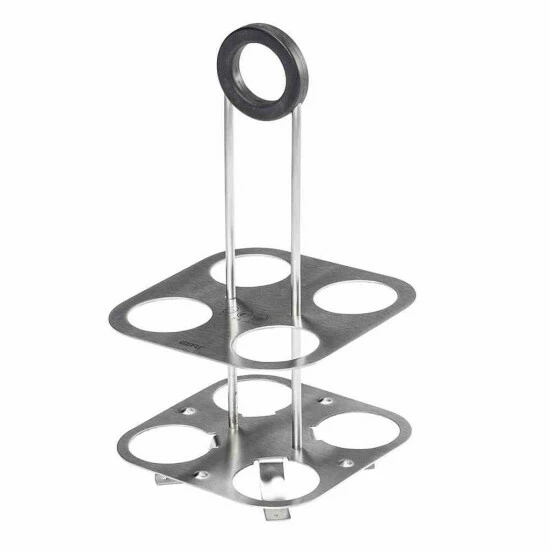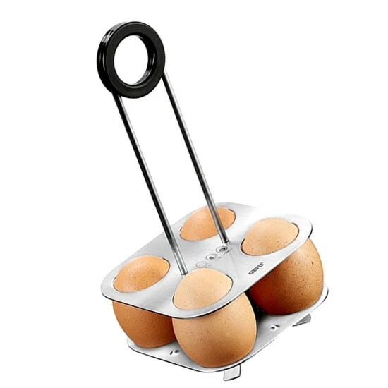 Zwei bewegliche Edelstahlplatten sorgen dafür, dass 4 Eier – von S- bis XL-Format – während des Kochvorgangs im Topf sicheren Stand haben. Und wenn sie gar sind, einfach die Eier entnehmen, obere Platte auf die untere absenken, Eier wieder einstellen und servieren! Durch die designige Kombination aus Edelstahl und schwarzem Kunststoff für den ringförmigen Griff ein praktischer und schöner Tischpartner! Der Eierhalter ist für Töpfe ab 12 cm Durchmesser einsetzbar.