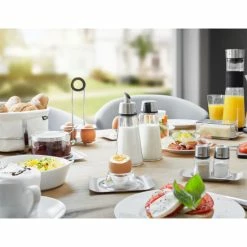 Viele von uns stellen sich kein Frühstück ohne gekochtes Ei vor – wir präsentieren ein cleveres Gadget, dank dem Sie Eier einfach und schnell zubereiten und servieren werden. Eierstand Brunch – aus Edelstahl mit schwarzem eleganten Griff ist nicht nur eine sehr praktische Sache, sondern auch eine stilvolle Ergänzung zu Ihrem Frühstückstisch. Es hält vier Eier, es kann auch verwendet werden, um Eier im Kühlschrank zu lagern. Im oberen Teil gibt es einen Hinweis darauf, wie viele Minuten Sie ein weich gekochtes Ei kochen, halbhart und hart – sehr nützliche Informationen, denn wer sich nie darüber wundert. Kann sicher in der Spülmaschine gewaschen werden, was sehr wichtig für Artikel ist, die verwendet werden, um rohe Eier zu lagern. Der Brunch-Stand ist ein praktisches und stilvolles Gadget, das Ihr Leben erheblich erleichtern wird.