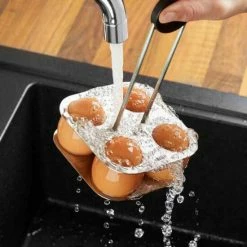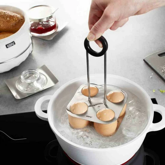 Bis zu vier Eier kommen einfach und schnell mit dem Eierkochhalter in und aus dem kochenden Wasser. Danach abschrecken und anschließend direkt im Eierhalter servieren.