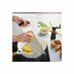Ob auf der Arbeitsfläche oder direkt über Topf und Pfanne: Der Kartoffelhobel mit seinen 12 speziell für das Schneiden von gegarten Kartoffeln ausgerichteten Klingen sorgt im Nu