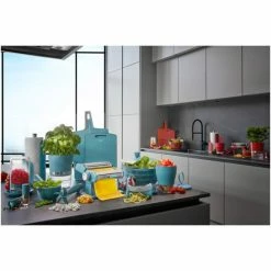 PASTA PERFETTA in attraktivem azurblau ist die Pastamaschine für die perfekte Herstellung von original hausgemachter Pasta. So lassen sich mit ein paar Handgriffen drei verschiedene Sorten von Teigwaren herstellen: Tagliolini, Tagliatelle und Lasagne. Dank der Walzen aus Leichtmetall mit einer hochwertigen Oberflächenveredlung lassen sich noch gesünder und reiner schmeckende Teigbahnen herstellen.