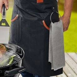 Eine durchdachte und praktische Grillschürze. Die aus gewachster Baumwolle gefertigte Kochschürze lässt sich einfach abwischen.