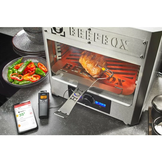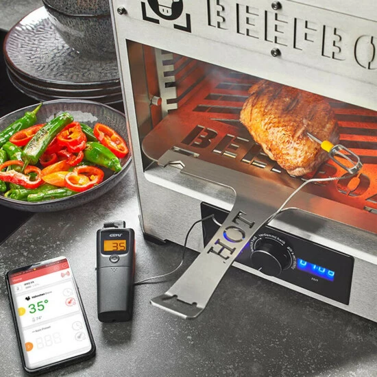 Grillen ist eine feste Größe in der Welt des Kochens. Die Möglichkeiten sind vielfältig und gehen deutlich über das olle Nackensteak vom Grill hinaus. Experimentierfreudige Griller und Grillerinnen werden ihre echte Freude mit dem Grill- und Bratenthermometer Control von Gefu haben. Das Thermometer bietet eine präzise digitale Temperaturkontrolle für punktgenaues Grillen, Braten und Räuchern. Das Grillthermometer ist per GrillThermo App (verfügbar für Android und iPhone) mit dem Handy verbunden, während die hochsensible Sonde des Grill- und Bratenthermometers präzise die Fleischtemperatur während des Garvorgangs misst. Mit Hilfe der App lassen sich fünf verschiedene Garpunkte für sieben unterschiedliche Fleischsorten überwachen. Zusätzlich gibt es eine Timerfunktion und die Möglichkeit verschieden individuelle Einstellungen vorzunehmen.