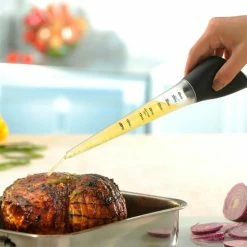Bratensaft oder Marinaden sorgen für einen unvergleichlich zart-würzigen Fleischgenuss. Ob Lammkeulen, Schmorbraten, Haxen oder Sauerbraten – mit der Braten- und Marinadenspritze können Fleischgerichte hervorragend verfeinert werden, denn mit ihrer Pipettenfunktion nimmt die Braten- und Marinadenspritze Flüssigkeiten perfekt auf. Dabei ermöglicht die aufgebrachte Skala von 10 bis 40 ml bzw. 1/4 bis 1/2 oz das exakte Dosieren.