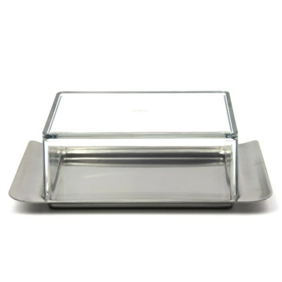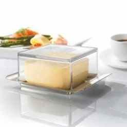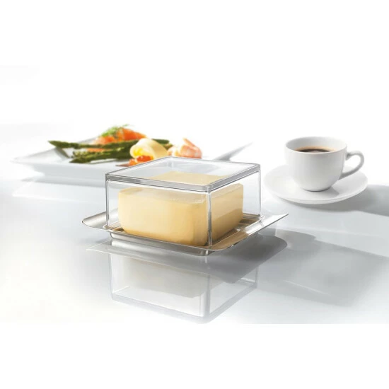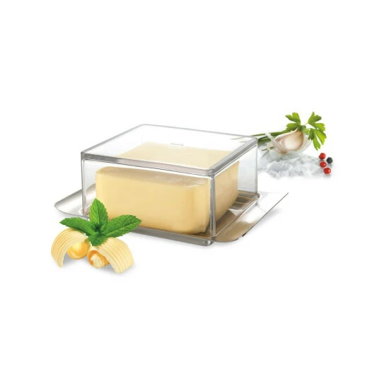 Die Butterdose BRUNCH ist perfekt zugeschnitten für ein 125 g – Stück Butter. Damit sie in jeder herkömmlichen Kühlschranktür ihren Platz findet, wurde der Untersetzer aus hochwertigem Edelstahl bewusst schlank gestaltet – aber mit großzügigen Griffen, die gut in der Hand liegen. Die Haube aus SAN-Kunststoff vermittelt eine verblüffende Glasoptik – unempfindlich, aber doch glasklar! Zudem ist die großzügige Haube so gestaltet, dass sie nicht mit der Butter in Berührung kommt – so ergibt sich die appetitliche Optik. Die schnörkellos schöne Butterdose ist natürlich spülmaschinengeeignet.Material: Edelstahl, sonstiger SAN – für 125 g – Stücke Butter – passt ins Seitenfach herkömmlicher Kühlschränke – ergonomische Griffleisten
