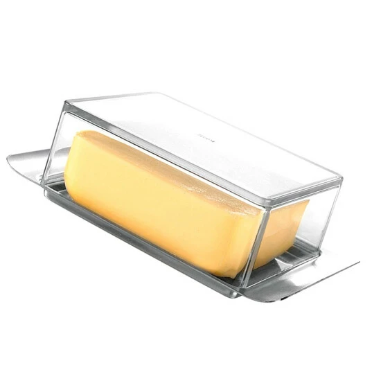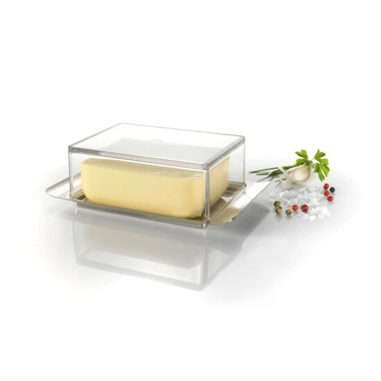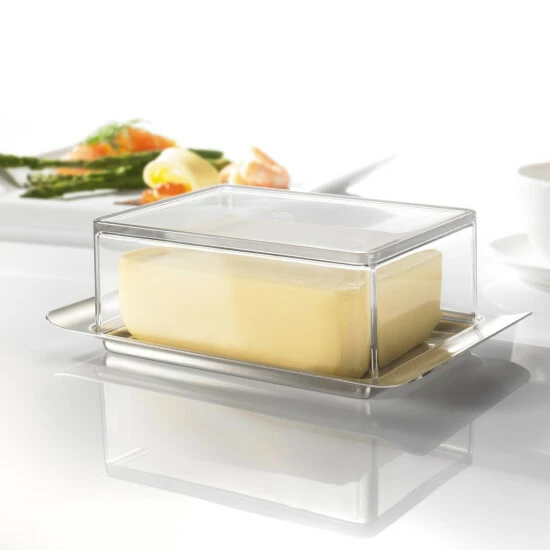 Für 250g Butter, passt ins Seitenfach herkömmlicher Kühlschränke. Mit ergonomische Griffleisten und aus hochwertiger Edelstahl/SAN-Kunststoff in Glasoptik, spülmaschinengeeignet.