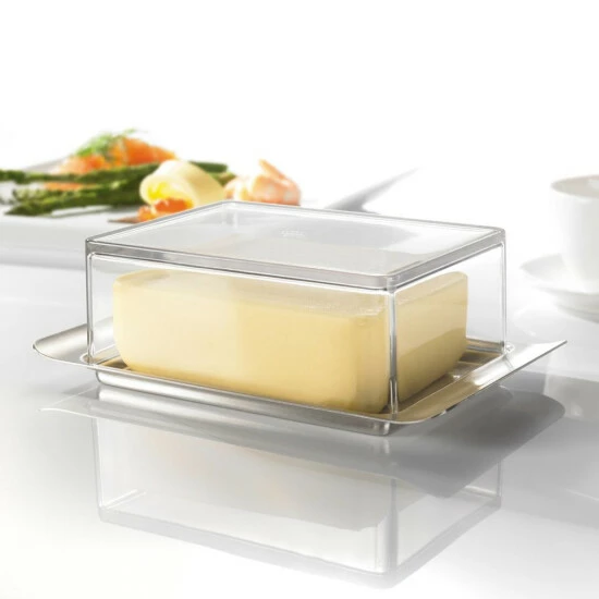 Bei einem guten Frühstück darf Butter keinesfalls fehlen. Mit der Butterdose Butelo von Gefu ist die Butter optimal geschützt und kann entsprechend auf dem Frühstückstisch serviert werden. Das aus Edelstahl gefertigte Unterteil mit einer Länge von 16,3 cm und einer Breite von 10 cm verhindert das Rutschen der Butter durch seinen leicht angehobenen Rand. Die 5 cm hohe Glocke aus SAN-Kunststoff in Glasoptik eignet sich für bis zu 250 g Butter und zeichnet sich besonders durch ihre robuste Fertigung aus. So wird Ihre Butter langanhaltend frisch gehalten und vor äußeren Einflüssen geschützt. Die Butterdose ist so geformt, dass sie in so gut wie jedes Kühlschrank-Seitenfach passt. Die leicht geschwungenen Griffleisten sorgen zudem für festen Halt beim Transportieren. Nach Gebrauch können Sie die Butterdose bequem in der Spülmaschine reinigen.