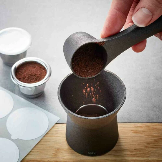 Nachhaltig und geldsparend zugleich – so gehts: Trichter auf leere Kapsel setzen, Espressopulver per Messlöffel einfüllen und mit Tamper verdichten, Kapsel mit selbstklebendem Aroma-Sticker verschließen – fertig. Nach Gebrauch einfach Folie entfernen, die Kapsel säubern und sofort ist sie wieder einsetzbar.