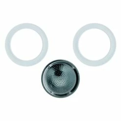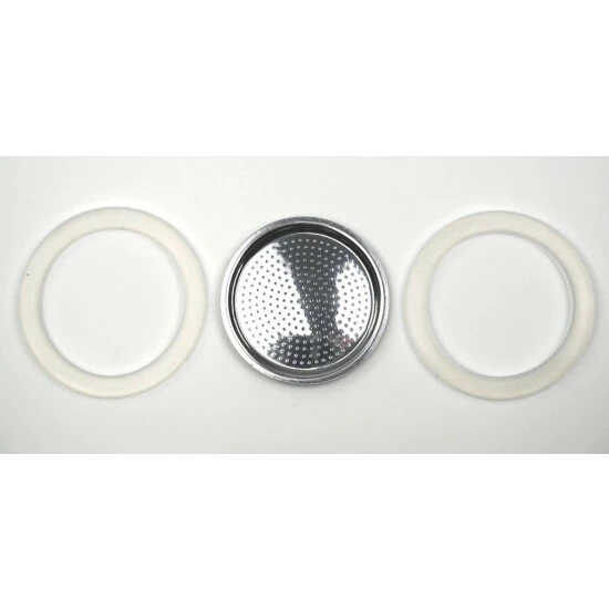 Mit diesem Set bekommen Sie zwei Dichtungsringe und einen Filter für den Espressokocher Emilio, 4 Tassen. Durchmesser: 6,4 cm Höhe 0,6 cm