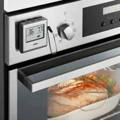 Dieses Backofenthermometer verhilft zu saftigen Braten, die außen kross und innen rosig sind. Ein Alarmton gibt Bescheid, falls die Temperaturvorgabe überschritten wird. Das Thermometer verfügt über einen Messbereich von 0 °C bis 250 °C. Der Timer kann bis 99 Minuten Zeit messen. Zur Ausstattung des Thermometers gehören eine Edelstahlsonde, ein hitzebeständiges Kabel, ein Befestigungsmagnet und ein aufstellbares Display.