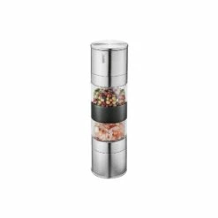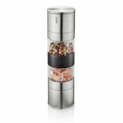 Ob Salz oder Pfeffer, mit dieser eleganten, platzsparenden Doppelmühle klappt das schnelle Nachwürzen im Handumdrehen. Zur bequemen Portionierung lassen sich beide Aromakappen abnehmen und als kleine Mahlteller nutzen. So muss man die Mühle nicht über heiße Töpfe halten und es bleibt nichts am stufenlos einstellbaren Mahlwerk haften.