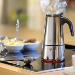 Frisch aufgebrühten Espresso, wie er in den meisten italienischen Familien zubereitet wird, gibt’s mit dem Espressokocher EMILIO aus Edelstahl.