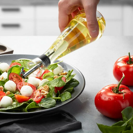 - formschöner Spender für Essig oder Öl aus Kristallglas inklusive tropfsicheren Edelstahlausgießern mit Verschlusskappe zum einfachen Dosieren