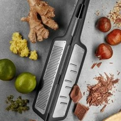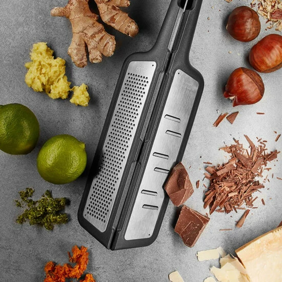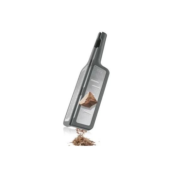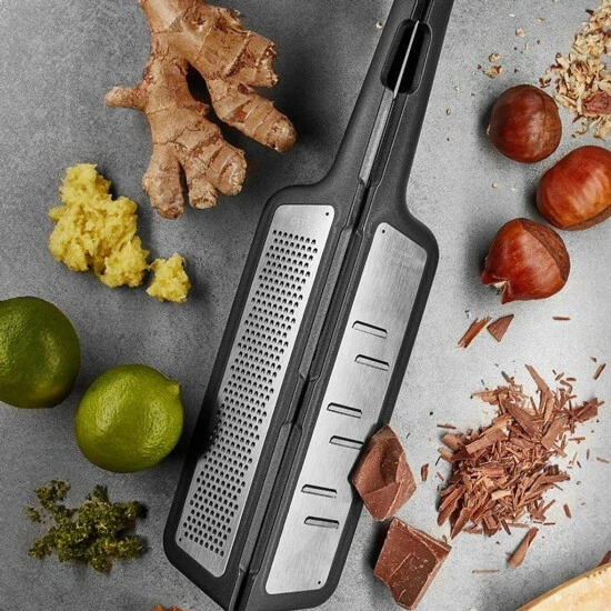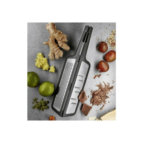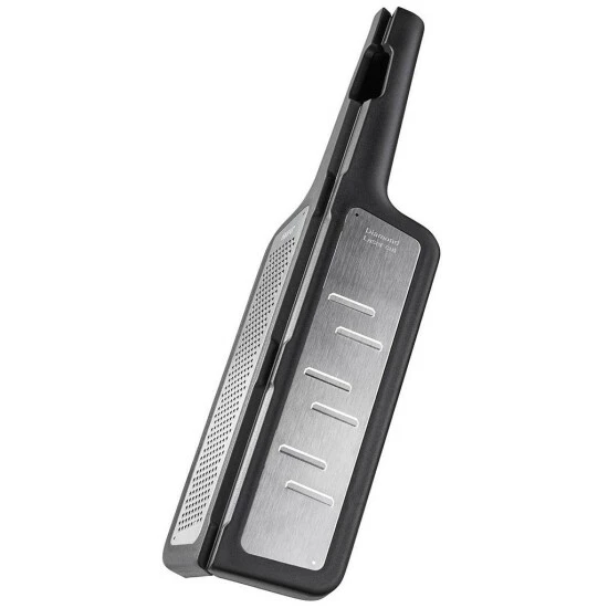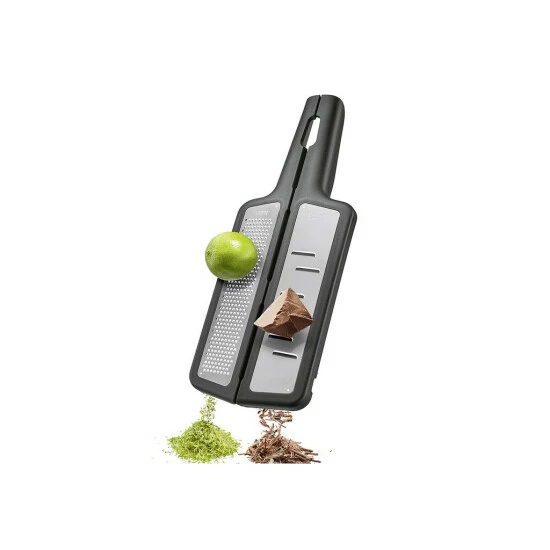 Dank der DIAMOND LASER CUT Technologie sind die Zubehörklingen extrem scharf und können auch mit harten Produkten problemlos zurechtkommen. Die Reibe ist mit zwei separaten Klingen unterschiedlicher Größe ausgestattet. Kleinere Ösen eignen sich perfekt für Zitrusfrüchte, Ingwer oder Parmesan. Die größeren eignen sich hervorragend für Schokolade, Käse oder Muskatnuss. Durch die Möglichkeit, das Produkt zu falten, können Sie es bequem über der Schüssel oder dem Topf verwenden, aber auch flach in der Küchenschublade verstecken. Die so konzipierte Reibe ist äußerst funktional und nimmt übrigens nicht viel Platz in der Küche ein.