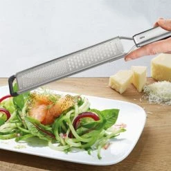 Streufeine Streusel von Zitrusfrüchten oder Muskatnuss, aber auch hauchzarte Flocken von Hartkäse oder Schokolade: Die lange Fein- und Grobreibe mit ihren zwei Reibeflächen sorgt für perfekte Ergebnisse.