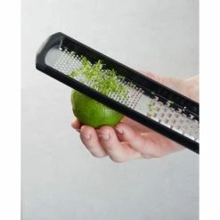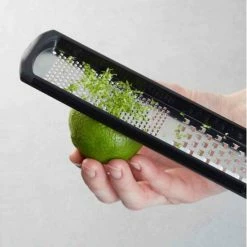 Ob grob oder fein gerieben, die zwei Reibeflächen bieten durch die extrem scharfen Lasercut – Klingen perfekte Ergebnisse von Ingwer, Parmesan, Schokolade, Zitronenschale, Möhren oder anderen festen Lebensmitteln. Die Schutzkappe, welche inklusiv ist, lässt sich als Auffangbehälter, und dank der kleinen Öffnung am Ende auch zum gezielten Dosieren verwenden. Ein Antirutschfuß und der ergonomische Griff aus Softgrip-Material sorgen für sicheres Handling. Maße: L/B/H 36,5 x 8 x 4,5 cm