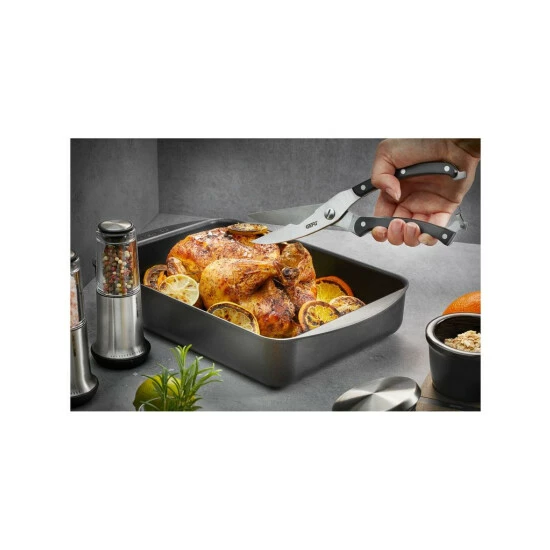 Mit der Profi-Geflügelschere VIGO lässt sich jede Art von Geflügel mühelos zerteilen und mundgerecht portionieren. Sie ist extrascharf, liegt besonders gut in der Hand und ein innovativer Federmechanismus im Scherengelenk macht sie besonders leichtgängig.