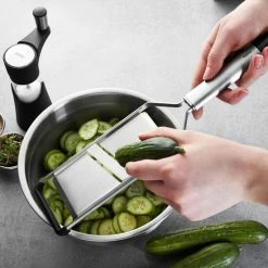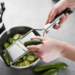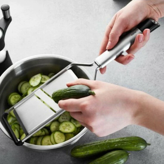 Die beidseitig geschliffene Klinge der Gemüse- und Kartoffelhobel liefert schnell und effizient gleichmäßige Kartoffel-, Gemüse- und Obstscheiben für Salate, Gratins, Aufläufe oder Kuchenbeläge.