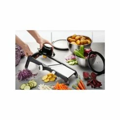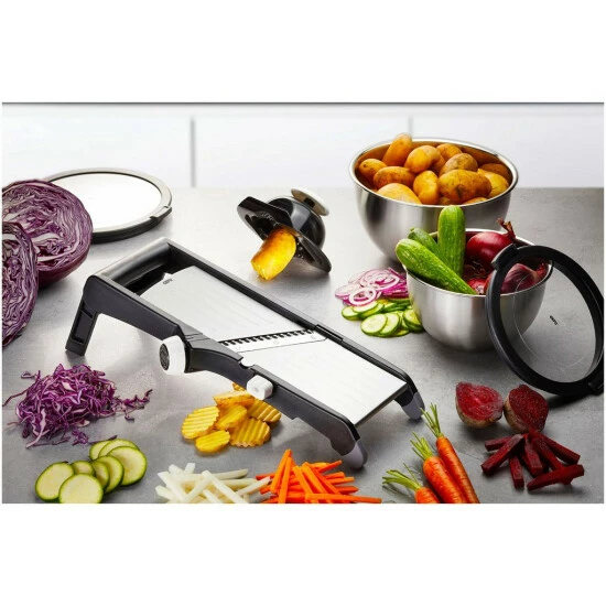 - VERSTELLBAR – verstellbare Schnittstärke von 1-9 mm für Scheiben; Juliennestreifen 4,5 & 9 mm; verstellbar in glatte oder gewellte Scheiben