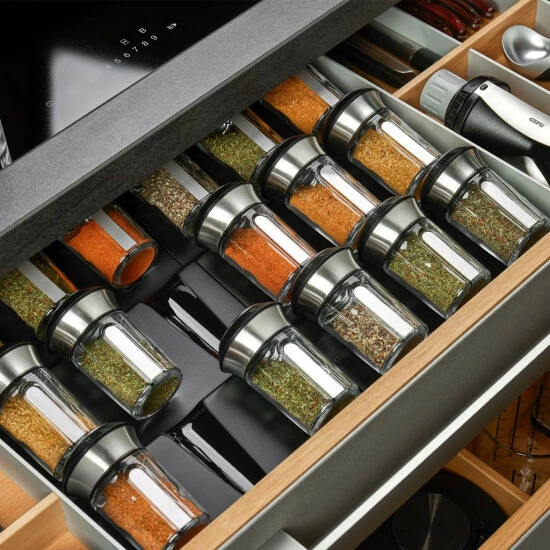 Der Gewürzstreuereinsatz passt in jede Schublade und kann mit weiteren Gewürzablagen ergänzt werden. So sind wirklich alle Deine Lieblingsgewürz- und Kräuterstreuer ordentlich verstaut.