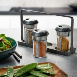 Besonders schön kommt dieses Set mit der Holzmenage aus hochwertigem Akazienholz mit der verdelten Oberfläche daher. So passt das Gewürz- und Kräuterstreuer Set perfekt auf einen schön gedeckten Tisch. In der Küche auf der Anrichte neben dem Herd erfüllt es auch seinen Zweck und ist eine klasse Geschenkidee.