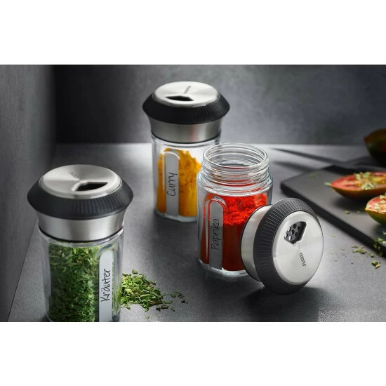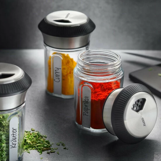 1 Gewürzstreuer mit einstellbarerer Streustärke, 6 Beschriftungsetiketten