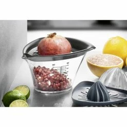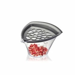 Schluss mit roten Fingern und fliegenden Kernen: einfach den halbierten Granatapfel auflegen und seinen kerngesunden Inhalt in den praktischen Messbecher darunter klopfen. Fertig! Mit dem zweiten abnehmbaren Aufsatz wird aus FRUTI im Handumdrehen eine wunderbare Saftpresse. Klopfen, Pressen, Messen – FRUTI kann einfach alles.