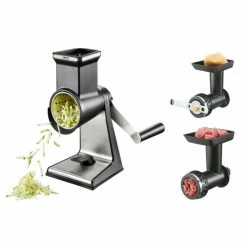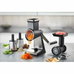 Grob, fein oder in Scheiben geschnitten: die multifunktionale Trommelreibe mit ihren extra scharfen LASER CUT Trommeln verarbeitet Obst, Gemüse, Maronen, Käse, Schokolade, Nüsse, etc. im Handumdrehen. Nach Umbau zum Fleischwolf liefert dieses vielseitige Werkzeug, dank seines praktischen Zubehörs, mühelos zerkleinertes Fleisch oder Gemüse, und auch Spritzgebäck in Bestform.