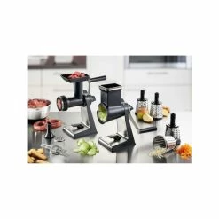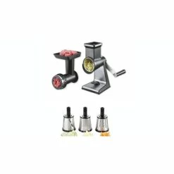– Fleischwolfvorsatz mit 2 Lochscheiben, Wurstfülltrichter und Spritzgebäckvorsatz