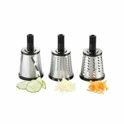 – Trommelreibe mit 3 extra scharfen LASER CUT Trommeln: für feine Flocken, grobe Raspeln oder dünne Scheiben