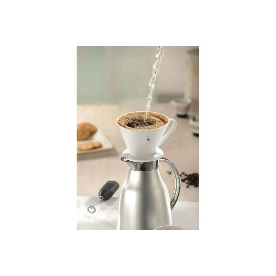 Kaffee – stilvoll handgebrueht.Willkommen im Club, wenn Sie auf stilvoll handgebruehten Kaffee schwoeren! Der Porzellan-Filter passt durch einen verlaengerten Stutzen auch ideal auf Isolierkannen, um ohne Waermeverlust ‘direkt hinein’ zu bruehen. Spuelmaschinenfest. Fuer handelsuebliche Filtertueten Groesse 4.Einfach Filtertuete in den Porzellan-Filter setzen, Kaffeemehl hineingeben und mit etwas heissem Wasser zum Quellen bringen. Anschliessend mehrmals weiteres heisses Wasser aufgiessen bis Sie die gewuenschte Menge frischen aromatischen Kaffee gebrueht haben. Ein echter Genuss! Masse: Ø 14,5 cm (mit Griff 17,5 cm)Ø Stutzen 3,7 cm, Hoehe Stutzen 4 cm Gesamthoehe (mit Stutzen) 14 cm