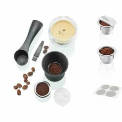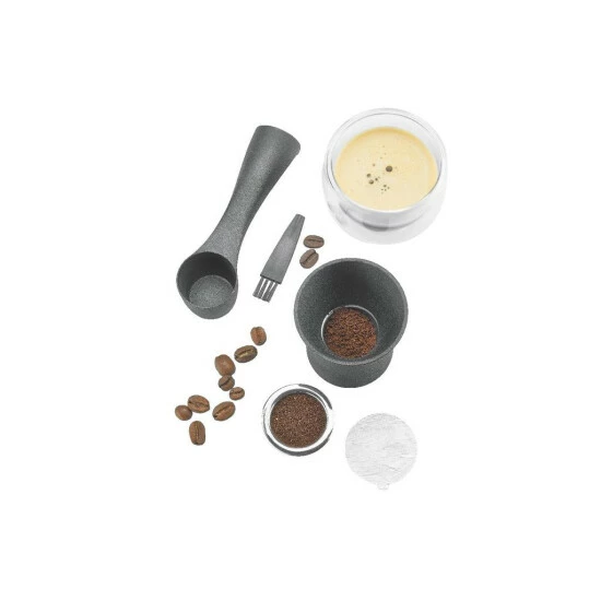 - Inkl. Trichter, 2x Edelstahlkapseln, Kaffeemaß mit Tamper, 80 Aroma-Sticker, 2x Ersatz-Dichtungsringe und Reinigungsbürste