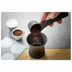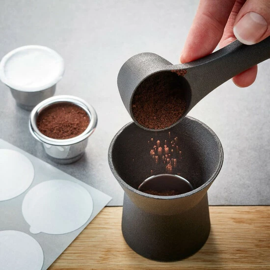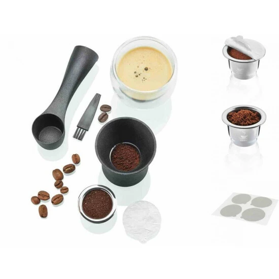 Nachhaltig und geldsparend zugleich ? so geht?s: Trichter auf leere Kapsel setzen, Espressopulver per Messlöffel einfüllen und mit Tamper verdichten, Kapsel mit selbstklebendem Aroma-Sticker verschließen – fertig. Nach Gebrauch einfachFolie entfernen, die Kapsel säubern und sofort ist sie wieder einsetzbar