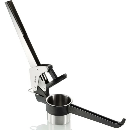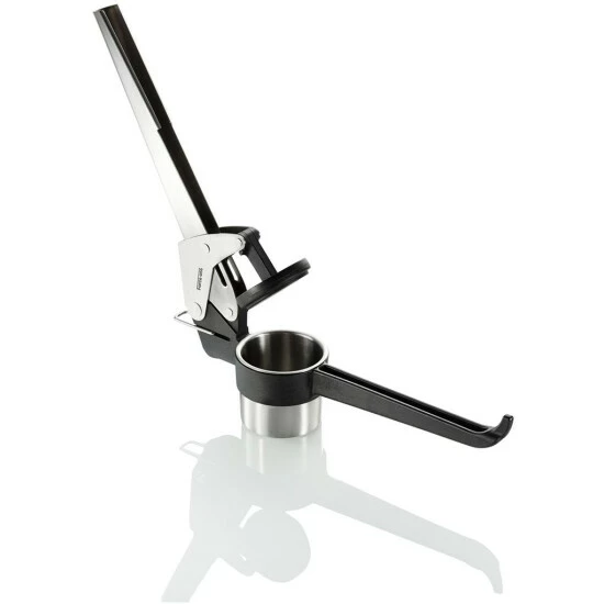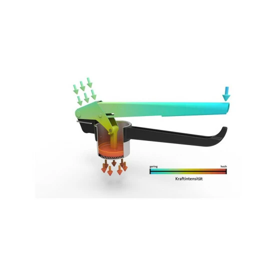 Die Kartoffel-, Saft- und Spätzlepresse erleichtert aufgrund ihrer optimierten Hebelmechanik wirkungsvoll das Pressen. Der Stempel bleibt immer waagerecht im Behälter, so wird eine optimale Kraftausbeute sichergestellt – und nichts quillt an den Seiten hinaus.
