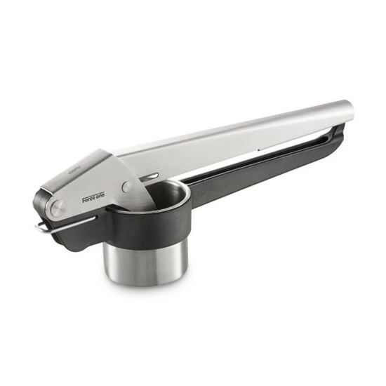 Für hausgemachte Spätzle, feines Kartoffel- oder Maronenpüree sowie frische Säfte: Die Kartoffel-, Saft- und Spätzlepresse FORCE ONE® ist ein vielseitiger Küchenhelfer. Die kraftsparende Hebelmechanik und Ihre extra langen Griffe sorgen für bequemes Arbeiten. Eine Besonderheit ist der Stempel – er ist so fixiert, dass er immer über dem Behälter steht – auch im geöffneten Zustand. Kein Tropfen, kein Kleckern! Zwei Lochscheiben – für Spätzle sowie für Püree und Saft – lassen sich einfach in den Behälter legen. Den kann man übrigens mühelos zur Reinigung in der Spülmaschine aus der Presse nehmen. Auf Töpfen und Schüsseln hat die Presse sicheren Stand – und Dank der Aufhängeöse ist sie nach Gebrauch einfach zu verstauen.