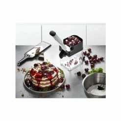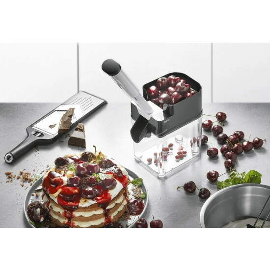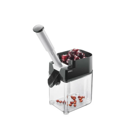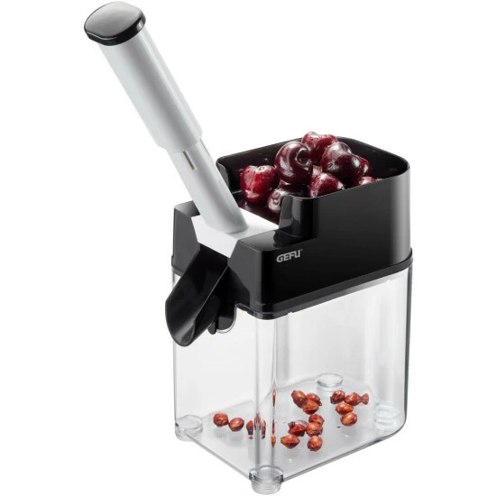Egal, ob die frische Ernte oder die konservierte Variante: auch große Mengen von Kirschen werden mit diesem Entkerner im Handumdrehen in kernlose Früchte umgewandelt. Einfache Bedienung: Die obere Schale mit Kirschen füllen und den Schlagstempel drücken. Dabei fallen die Kerne in den großen Auffangbehälter, das fruchtige Ergebnis rutscht seitlich in eine separate Schüssel.