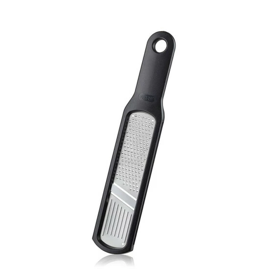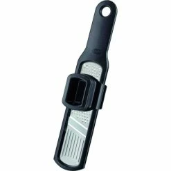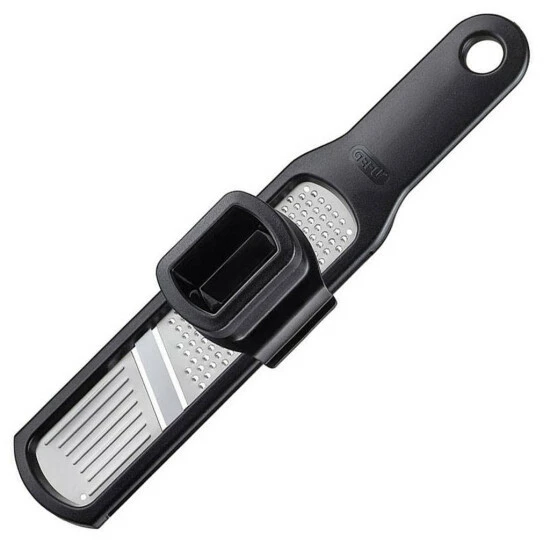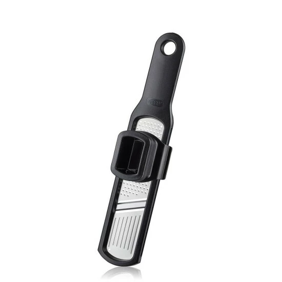 2 in 1 Talent: Vorderseite zum raspeln, Rückseite zum hobeln. Dazu gibt es einen Restehalter, umm Verletzungen zu vermeiden. Schnittstärke 1 mm. Maße: L/B/H 23 x 4,5 x 3,6 cm