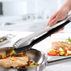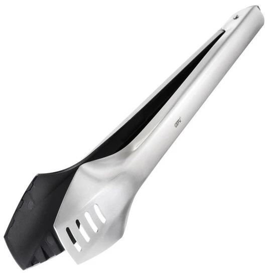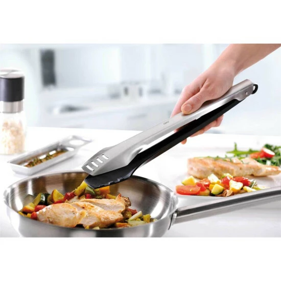 Doppelter Einsatz! Diese Koch-und Grillzange besteht aus einem Edelstahlelement für Einsätze am Grill und in unbeschichtetem Kochgeschirren und einem Nylon-Element, mit dem in beschichteten Töpfen und Pfannen gearbeitet werden kann. Sie ist platzsparend arretierbar und mit Aufhängeöse ausgestattet. Ihre Hitzebeständigkeit bis 210 °C lässt sie auch am heißen Grill gut aussehen. Auch die Länge von 35 cm sorgt für bequemes Arbeiten. Natürlich ist sie zur leichten Reinigung in der Spülmaschine geeignet.