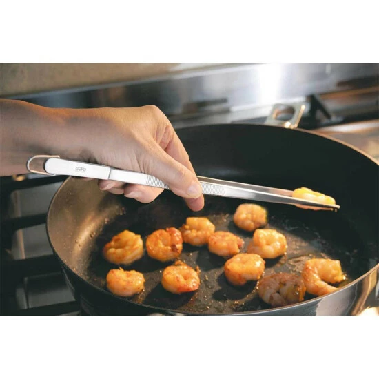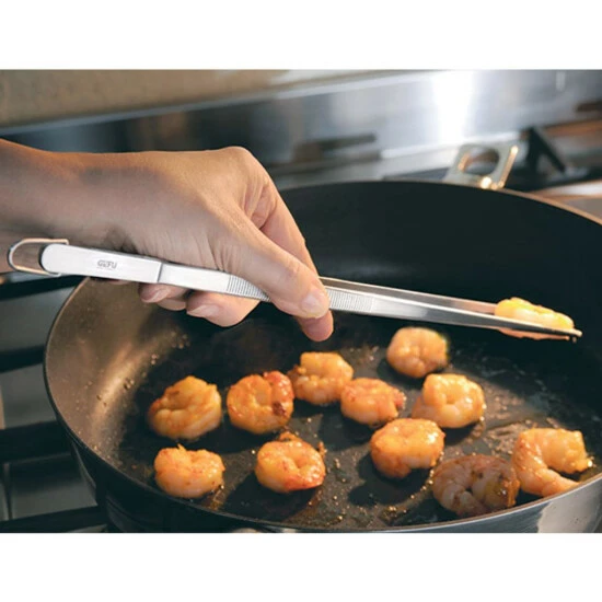 Pinzette mit multiplen Einsatzgebieten: Zum Wenden und Entnehmen, sowie zum Servieren bei Tisch. Ausgewogene Federkraft zur optimalen Kraftübertragung.