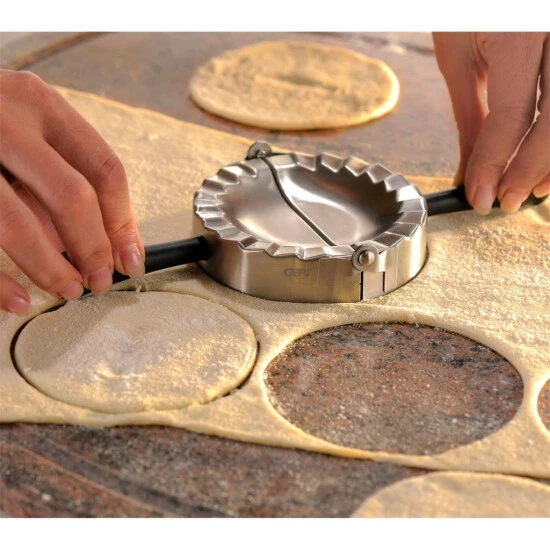 Einfach den Teig mit der Unterseite ausstechen, auf die bemehlte Innenseite legen und BefÌllen. Danach entnehmen und wie gewohnt zubereiten. Hochwertige Edelstahl/Kunststoffkombination, spÌlmaschinenfest. Zur Herstellung frischer, halbrunder Ravioli oder Maultaschen Durchmesser 10 cm Unterseite dient als Teigausstecher Ergonomische Griffe Edelstahl/Kunststoff SpÌlmaschinenfest
